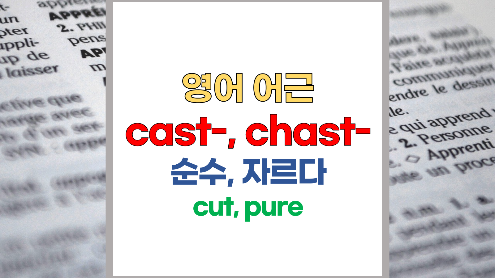 | 영어 어근 cast-, chast-는 라틴어(Latin) castrare, castigatus, castigare, castus, carere, castrum에서 유래했습니다. 순수, 자르다, cut, pure라는 기본적인 의미를 갖고 있습니다. |